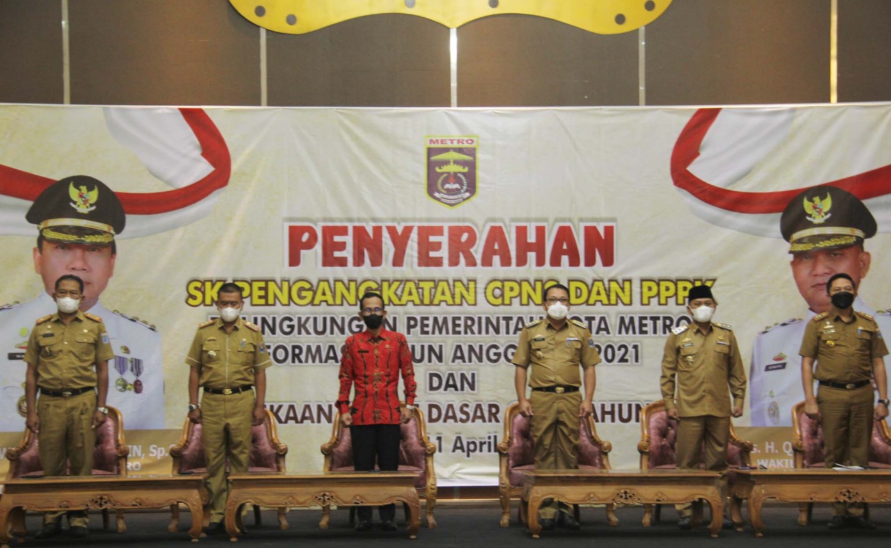 Pemerintah Kota Metro gelar acara Penyerahan SK Pengangkatan CPNS dan PPPK di Lingkungan Pemerintah Kota Metro Formasi Tahun Anggaran 2021 serta Pembukaan Diklat Dasar CPNS yang berlangsung di Gedung Sessat Agung Kota Metro, Senin (11/04/2022).