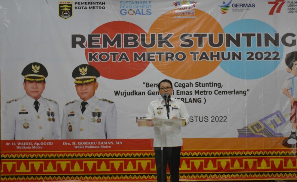 Sementara itu Walikota Metro Wahdi menjelaskan bahwa Pemerintah telah menetapkan target penurunan prevalensi stunting dalam RPJMN 2020-2024 sebesar 14% di tahun 2024, dan untuk mencapai target yang sangat optimis tersebut perlu kerja keras dari semua pihak baik Pemerintah maupun masyarakat diperlukan rata-rata penurunan prevalensi stunting 2,7 % setiap tahun bila menggunakan dasar prevalensi stunting tahun 2019 yang sebesar 27,7%.