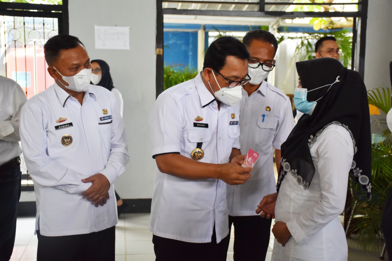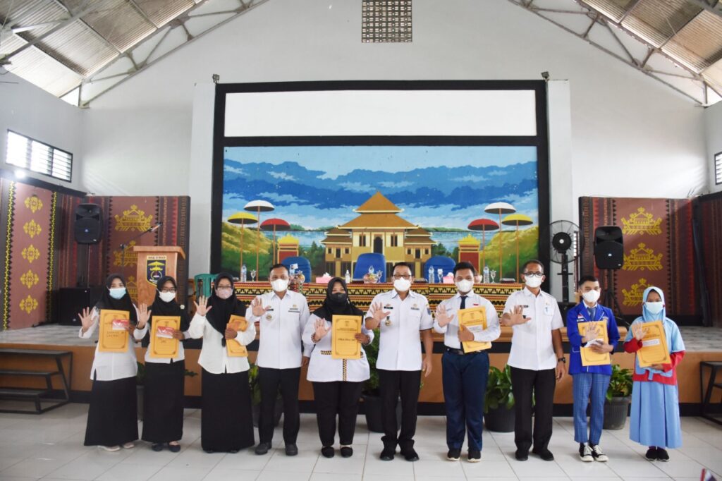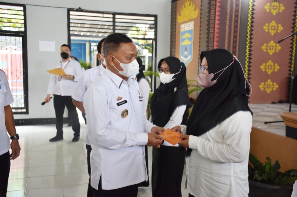 Walikota Metro bersama Wakil Walikota Metro menghadiri acara Pemberian Dana Bantuan Transport bagi Guru Honor ber-NUPTK dan Pemberian Penghargaan Pemenang Lomba Kegiatan Bakat dan Kreativitas Siswa Jenjang SD dan SMP Tahun 2021 yang berlangsung di Aula Dinas Pendidikan dan Kebudayaan Kota Metro, Rabu (29/12/21).