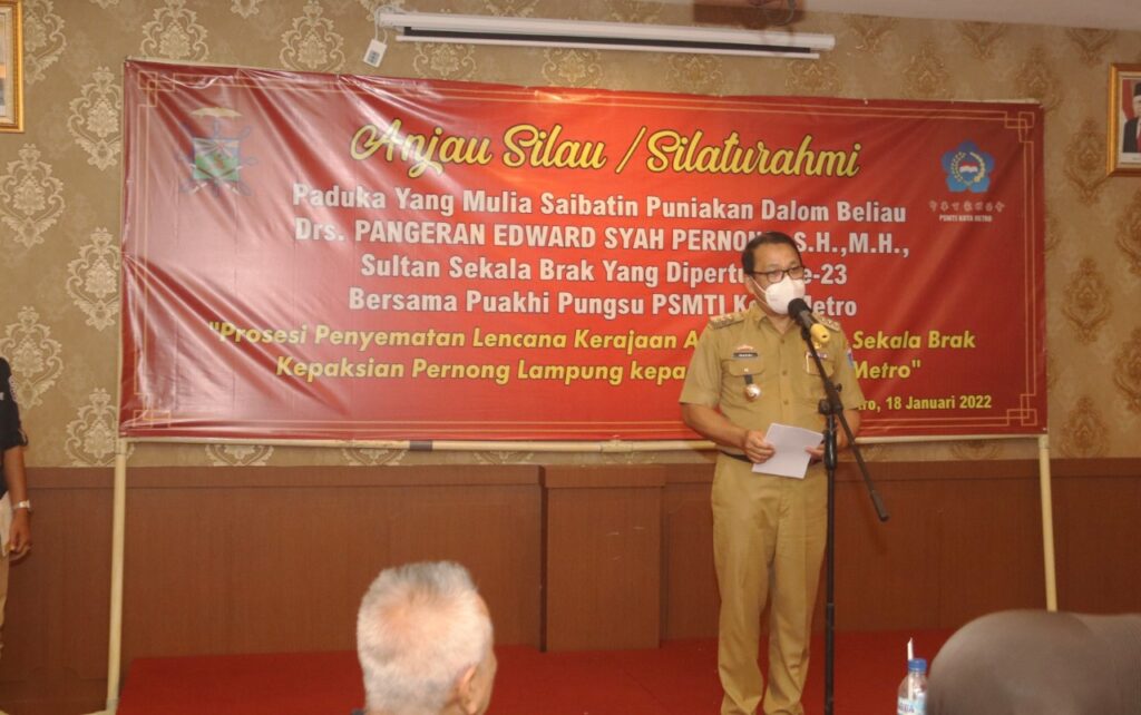 Walikota Metro Wahdi hadiri Anjau Silau/Silaturahmi dengan Kerajaan Sekala Brak Paduka YM SPDB Drs.Pangeran Edward Syah Pernong, SH.,MH Sultan Sekala Brak Yang Dipertuan ke-23, yang diselenggarakan PSMTI (Paguyuban Sosial Marga Tionghoa Indonesia) Metro, di Ballroom Grand Venetian Hotel Metro, Selasa, (18/01/2022).
