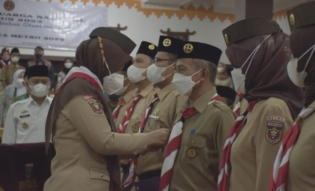 Walikota Metro Wahdi menghadiri pelantikan Pengurus Saka Kencana Kota Metro Tahun 2022 yang berlangsung di Aula Pemerintah Kota Metro usai mengikuti Acara Virtual Puncak Peringatan HARGANAS Ke-29, Kamis (07/07/2022).