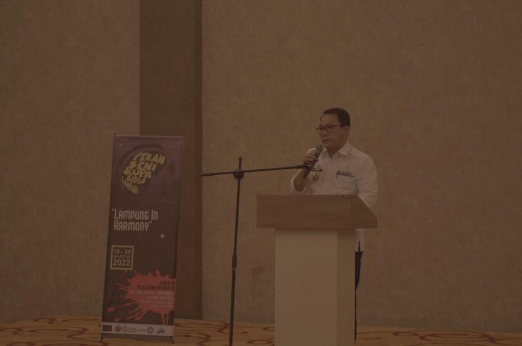 Walikota Metro Wahdi mendampingi Wakil Gubernur Lampung Chusnunia Chalim menghadiri pembukaan Pekan Seni Rupa Aidia Lampung bertema Lampung In Harmony Tahun 2022, di Ballroom Hotel Aidia Grande, Kamis (18/08/2022).