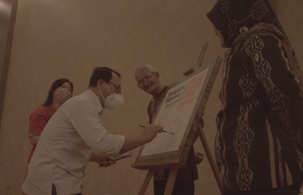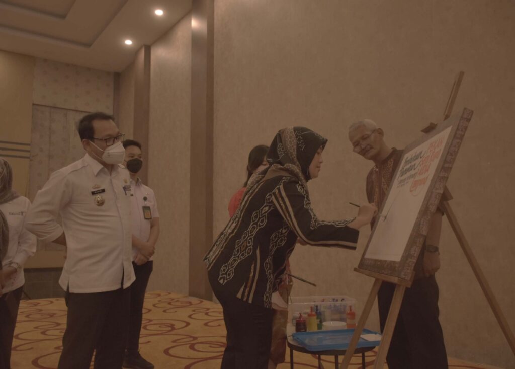 Acara dilanjutkan dengan penandatanganan diatas kanvas sebagai tanda dibukanya Pekan Seni Rupa Aidia Lampung. (bg/nv)