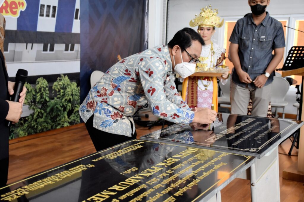 Walikota Metro Wahdi, meresmikan Gedung SMP Kristen BPK Penabur, dengan simbolis pemukulan Gong, di Aula setempat, Sabtu, 28/5/2022.