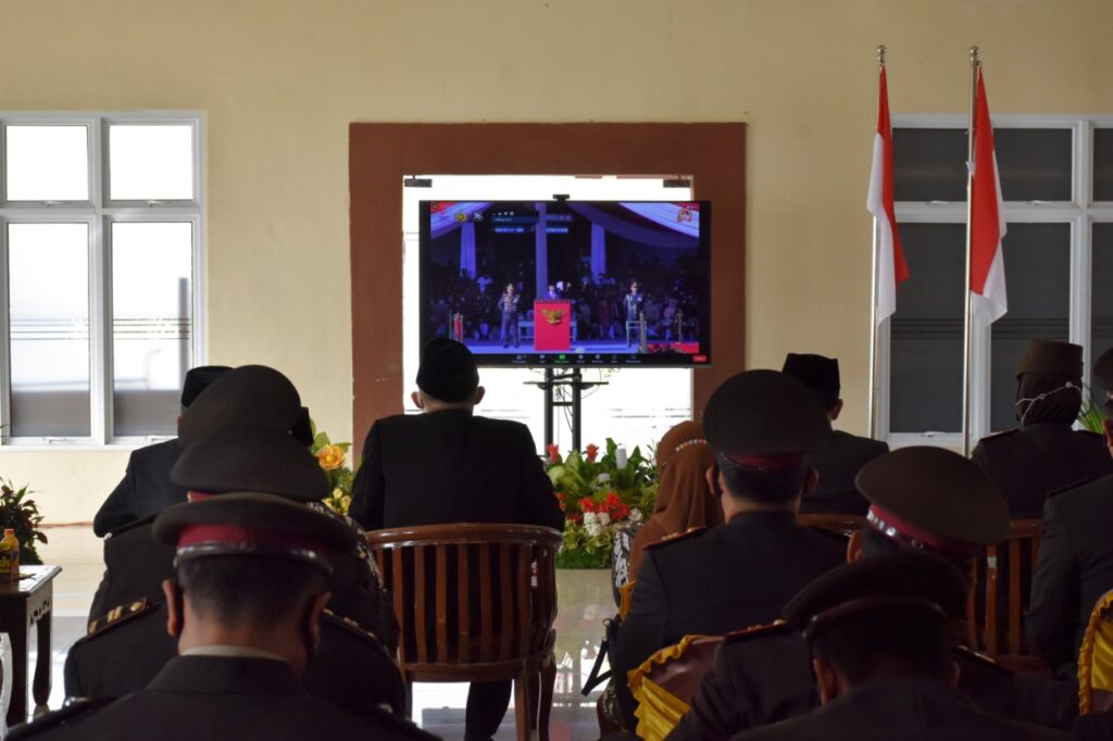 Walikota Metro Metro mengikuti upacara secara virtual. Upacara ini dalam rangka peringatan Hari Bhayangkara ke-76 yang berlangsung di Mapolres Kota Metro, Selasa (05/07/2022).