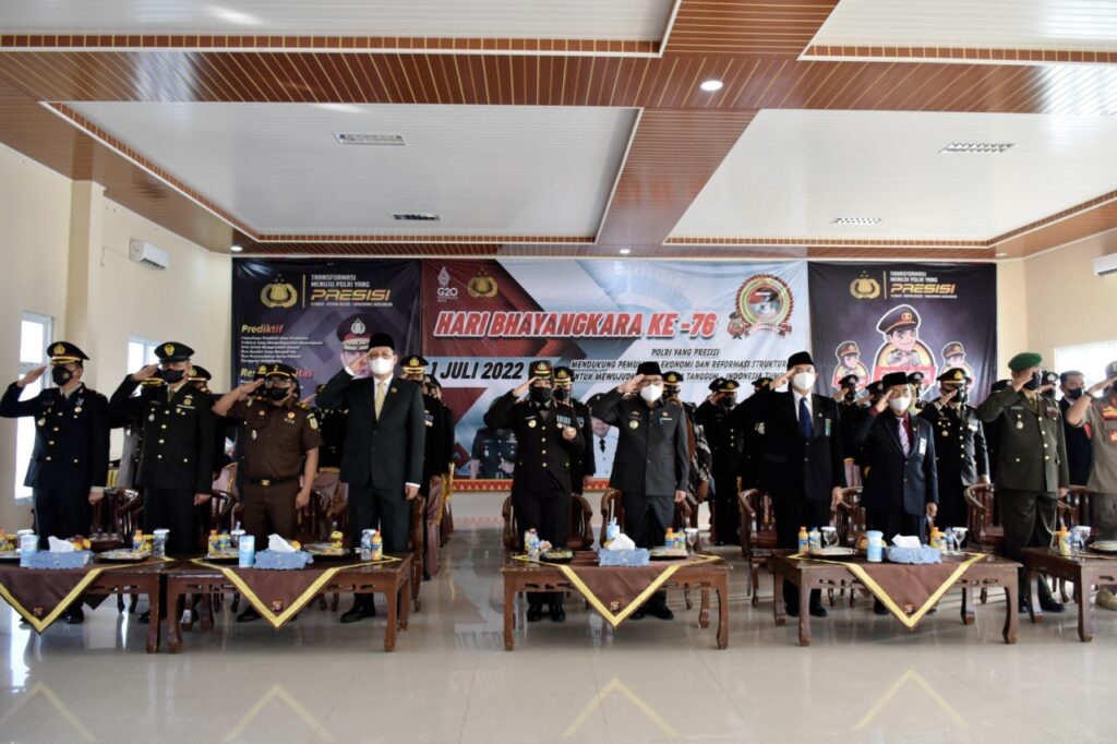 Peringatan HUT Bhayangkara ke-76 mengambil tema ‘Polri yang Presisi Mendukung Pemulihan Ekonomi dan Reformasi Struktural untuk Mewujudkan Indonesia Tangguh, Indonesia Tumbuh’. Acara tersebut juga diikuti ribuan personel Polri seluruh Indonesia.