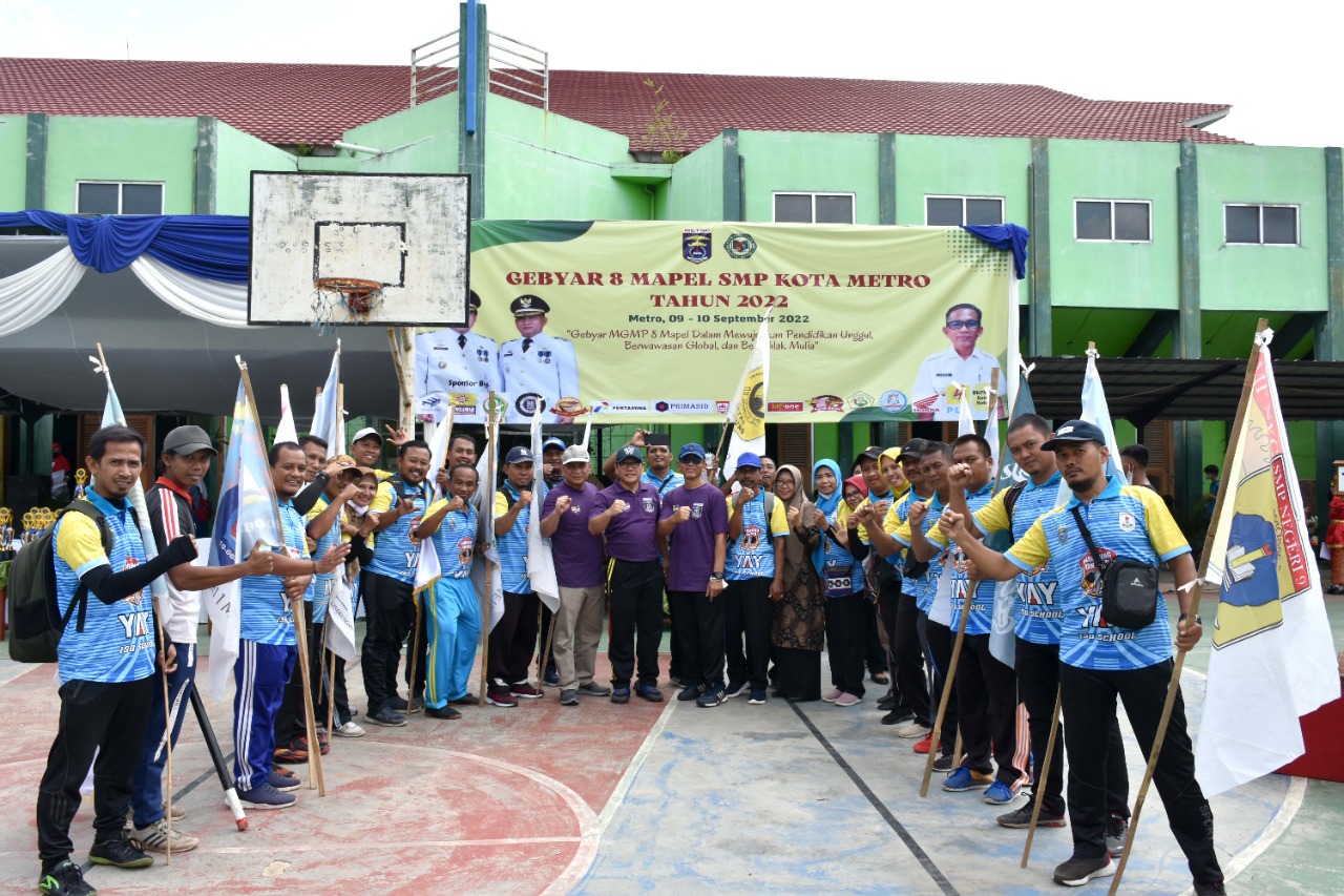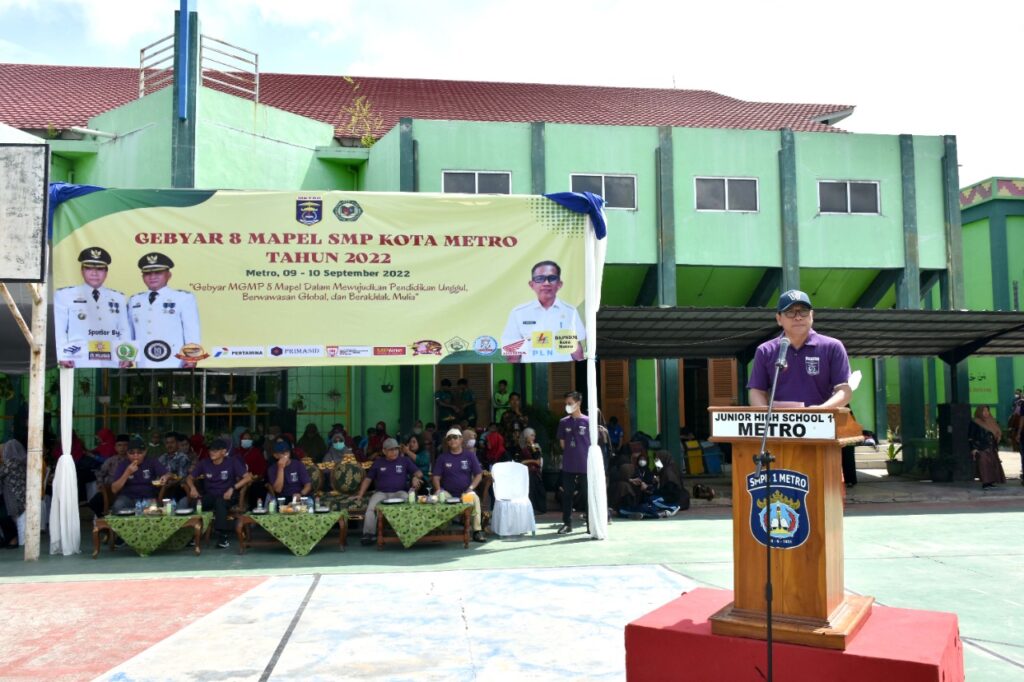 Walikota Metro didampingi Asisten I dan Kadis Pendidikan dan Kebudayaan Kota Metro membuka kegiatan Gebyar 8 Mapel SMP Kota Metro Tahun 2022. Acara yang mengusung tema “Gebyar MGMP 8 Mapel Dalam Mewujudkan Pendidikan Unggul, Berwawasan Global dan Berakhlak Mulia” tersebut diikuti 32 SMP Negeri dan Swasta serta MTS se-Kota Metro yang berlangsung di SMP N 1 Kota Metro, Jumat (09/09/2022).
