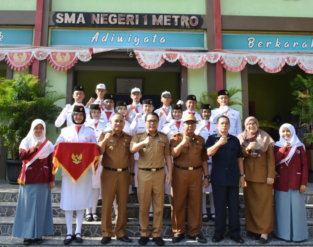 Walikota Metro Wahdi menjadi pembina upacara dalam rangka pembinaan dan pendidikan karakter serta kedisiplinan Siswa SMA Negeri 1 Metro, Senin (05/09/2022).