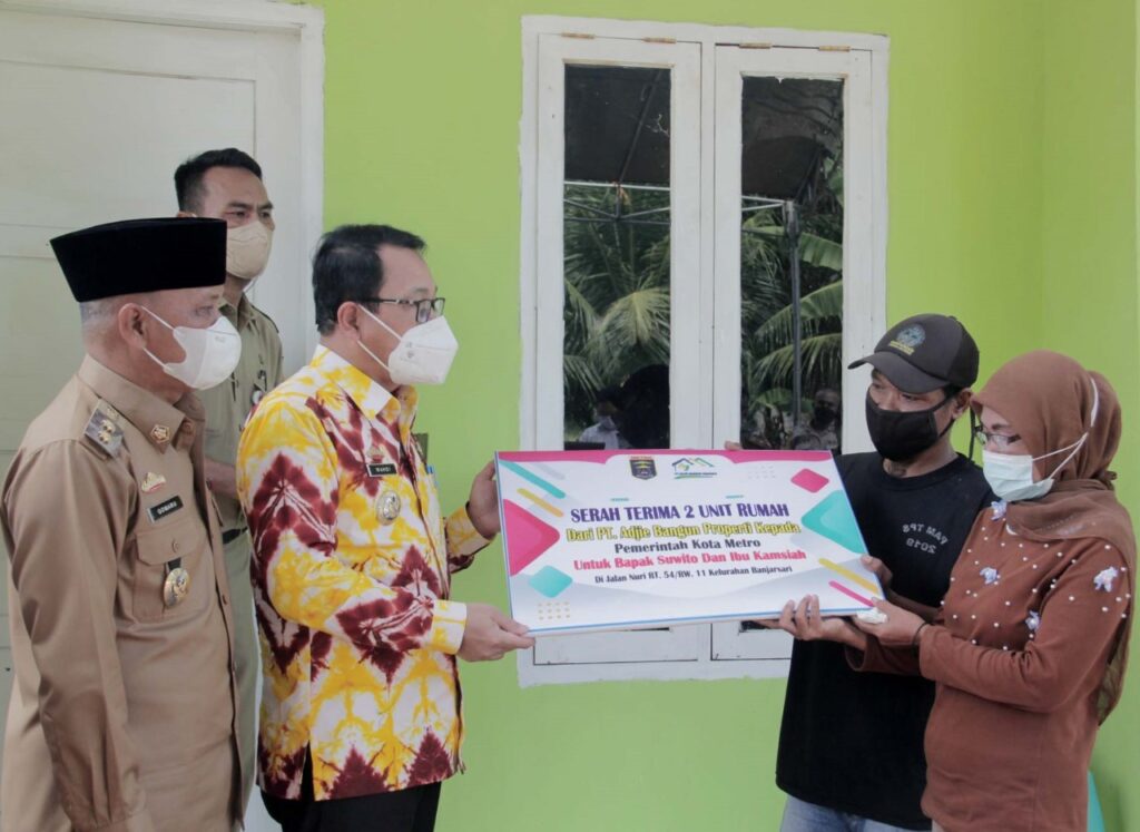 Walikota Metro bersama Wakil Walikota Metro serahkan Kunci Bedah Rumah Bantuan yang berlokasi di Jl. Nuri Kelurahan Banjarsari, Kecamatan Metro Utara, Selasa (26/04/2022). Diketahui, Serah Terima 2 Unit Rumah dari PT. Adjie Bangun Properti kepada Pemerintah Kota Metro untuk Bapak Suwito dan Ibu Kamsiah di Jl. Nuri RT. 54/RW.11 Kelurahan Banjarsari.