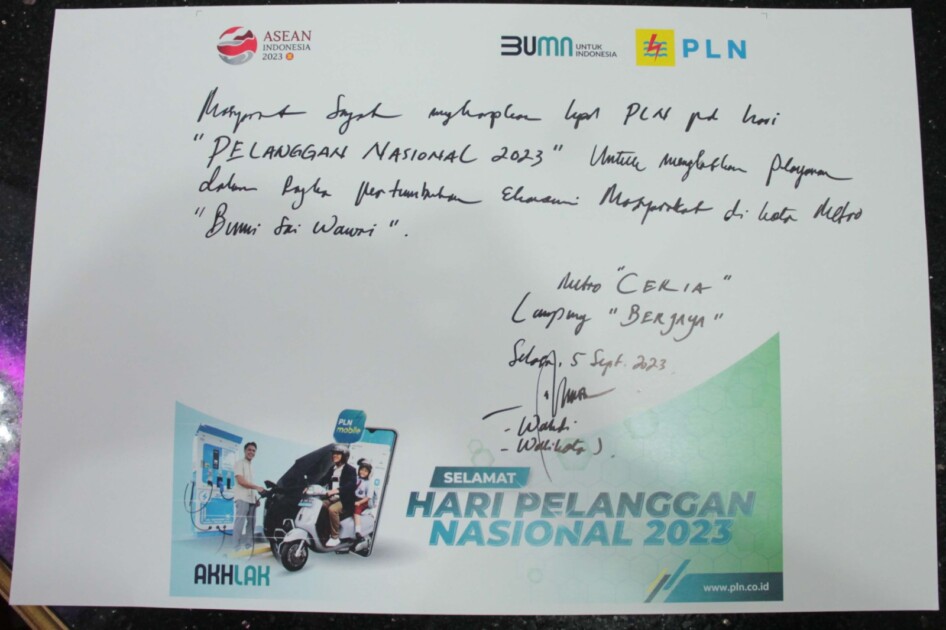 Bertuliskan Masyarakat Sangat Mengharapkan Kepada PLN pada hari “Pelanggan Nasional 2023” Untuk Meningkatkan Pelayanan Dalam Rangka Pertumbuhan Ekonomi Masyarakat di Kota Metro “Bumi Sai Wawai”. (tk/bgs/yus)