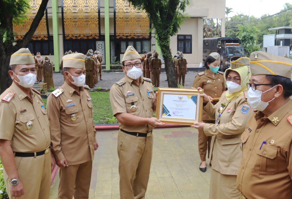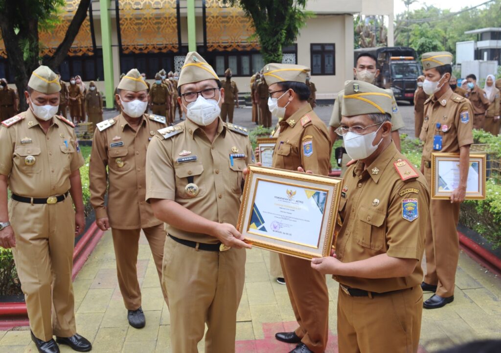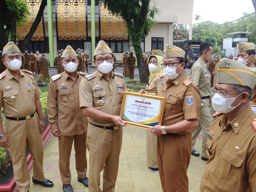 Pemerintah Kota Metro gelar Apel Mingguan sekaligus memberikan Apresiasi dan Penyerahan Piagam Penghargaan Prestasi Zona Bebas ZI dan Pelayanan Terbaik dari Ombudsman serta Laporan Akuntabilitas Kinerja Instansi Pemerintahan Terbaik Tingkat Kota Metro yang berlangsung di Halaman Pemerintah Kota Metro, Senin (07/02/2022).
