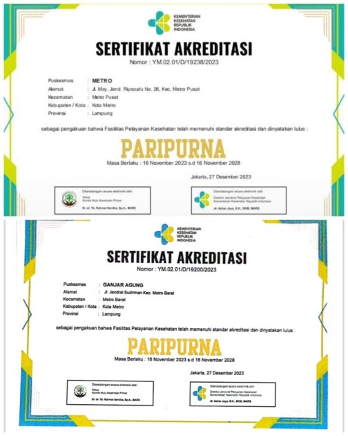 Demi meningkatkan mutu dan pelayanan kesehatan bagi masyarakat, Pemerintah Kota Metro melalui Dinas Kesehatan berhasil meraih Predikat Akreditasi tingkat Paripurna bagi 5 Puskesmas di Kota Metro.